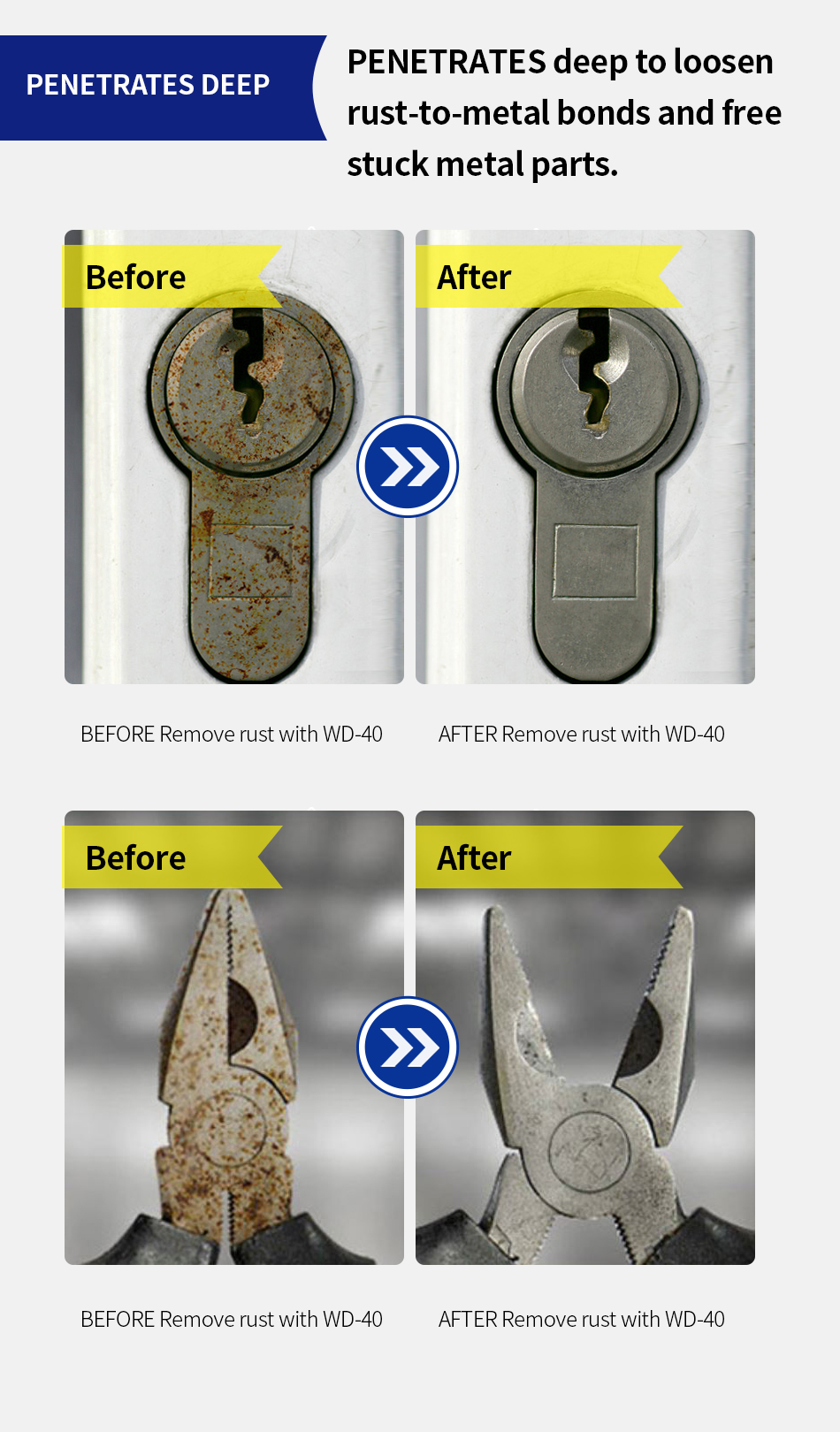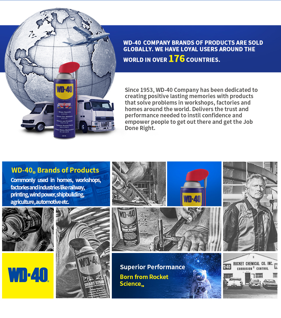 WD-40® Multi-Use Product protects metal from rust and corrosion, penetrates stuck parts, displaces moisture and lubricates almost anything. It even removes grease, grime and more from most surfaces.