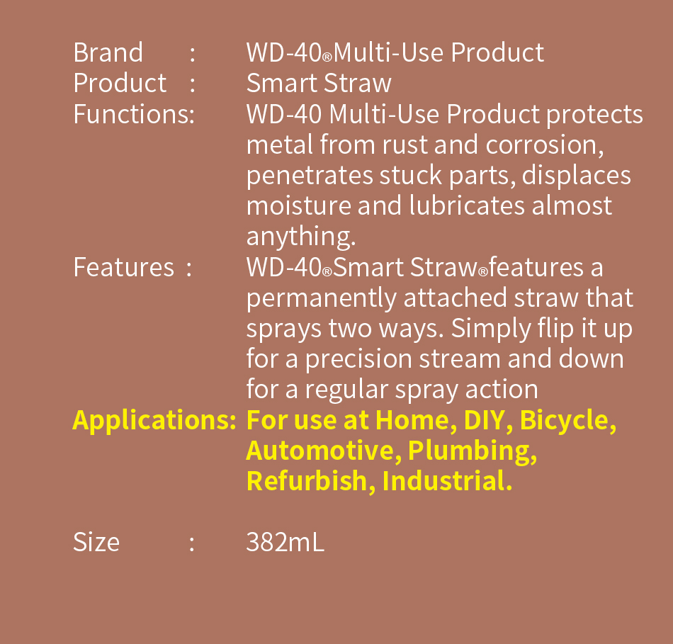 382ml SMART STRAW - NEVER LOSE THE STRAW AGAIN WITH WD-40 SMART STRAW. It features a permanently attached straw that sprays two ways. Simply flip it up for a precision stream and down for a regular spray action.