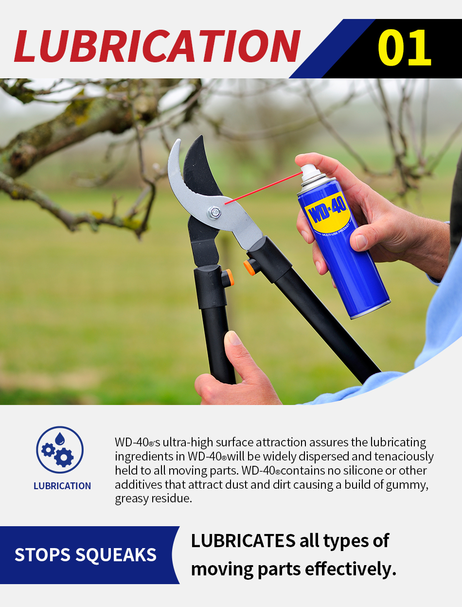 WD-40® Multi-Use Product lubricates moving parts such as hinges, wheels, rollers, chains and gears. It protects against rust and corrosion on items like tools and sporting equipment. It penetrates to free stuck corroded parts like nuts, bolts, valves and locks. It quickly removes adhesives, corrosion and paint. It displaces moisture to restore water flooded equipment such as engines, spark plugs and power tools.