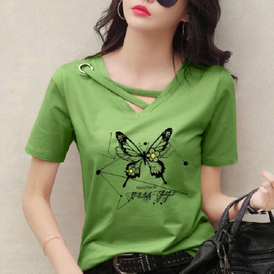 BS女式衬衫冰丝V领加大码衬衫宽松时尚休闲泡芙短袖套头衫